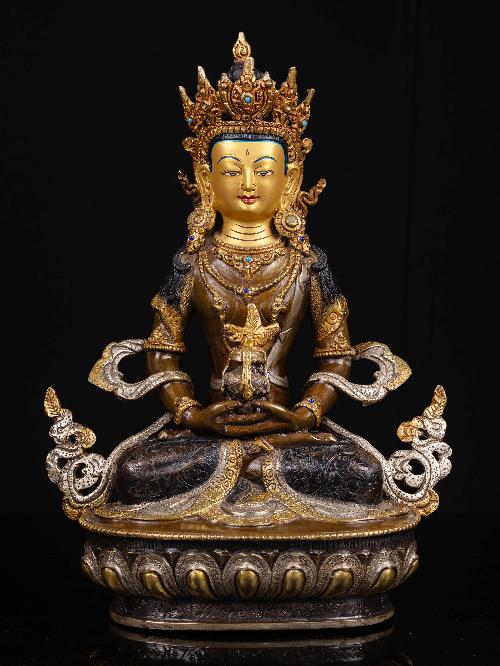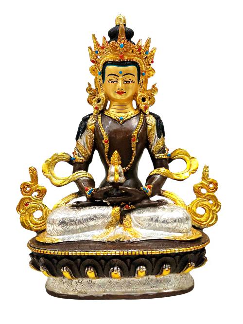 23cm Aparimita, Buddhist Handmade Statue, Chocolate And Silver Oxidized With Extra Gold Plated, Stone Setting, Face Painted