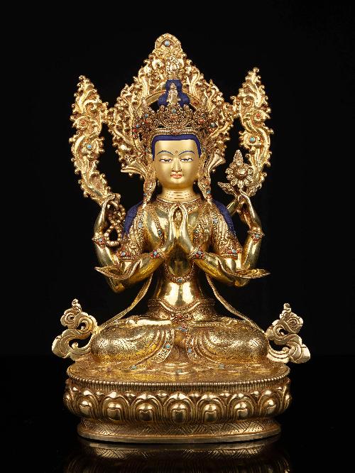 This 62cm tall Chenrezig, Buddhist Handmade Statue, Full Gold Plated, Face Painted, Stone Setting And High Quality (Product Code: HMS34675) weighs 16.21kg and is available at an offer price of US$1700.