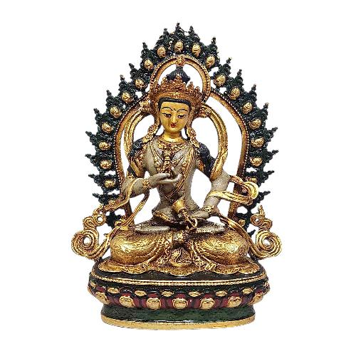 A variety of compact, transportable Buddhist statues created in Nepal utilizing ceramic or vacuum mold techniques. These tiny statues, which offer a lovely and portable expression of Buddhist art and devotion, are perfect for travelers and each measures less than 8 inches in height. Each statue is painstakingly created using age-old methods to produce an exquisite, finely detailed object.
