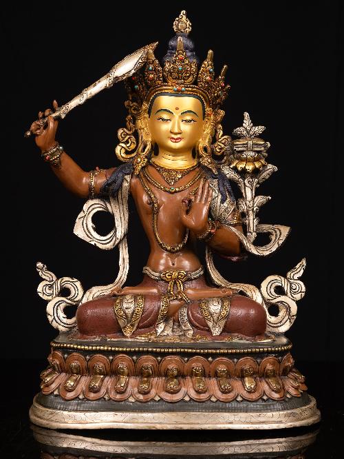 The partly silver plating and dark oxidation finishing is a testament to the craftsmanship and artistic vision of the creators. It showcases their ability to harmonize different elements, resulting in a distinctive and captivating aesthetic for the Maha Manjushri.