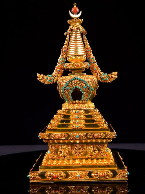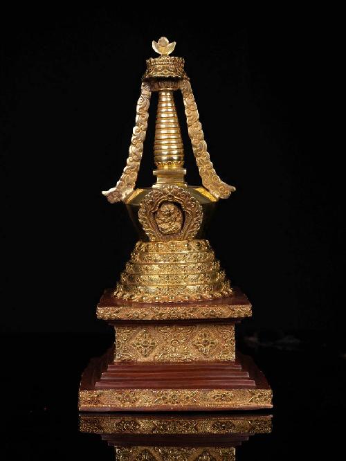 Buddhist Stupa Descent From God Realm -lhabab Chorten, Full Fire Gold Plated, Antique Finishing