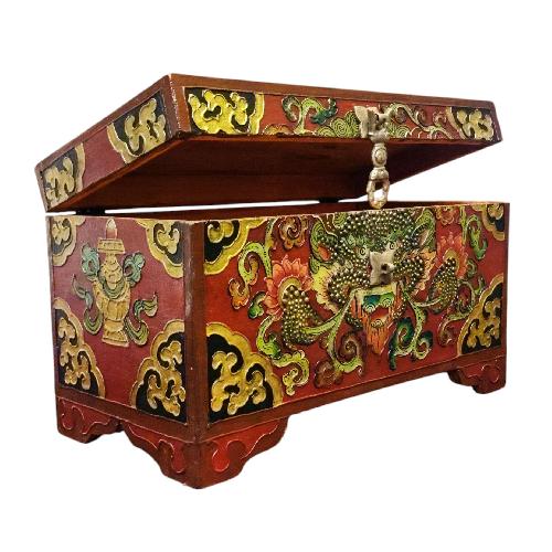 A Tibetan wooden box is a handcrafted storage container made from wood and often adorned with intricate Tibetan motifs and vibrant colors. These boxes are typically crafted by skilled artisans using traditional techniques passed down through generations. The decorations on the box usually include symbols of good fortune, such as lotus flowers, endless knots, dragons, or mythical creatures, and are painted in vivid hues like red, blue, green, and gold. These motifs not only add to the aesthetic appeal but also carry significant cultural and spiritual meanings in Tibetan Buddhism.