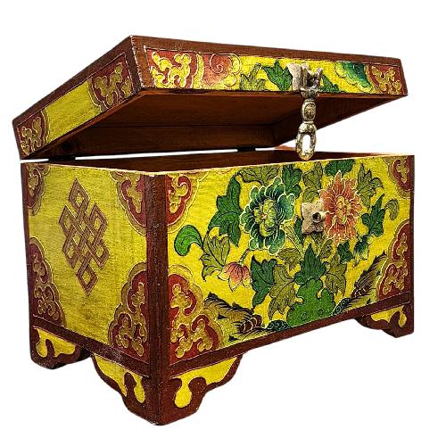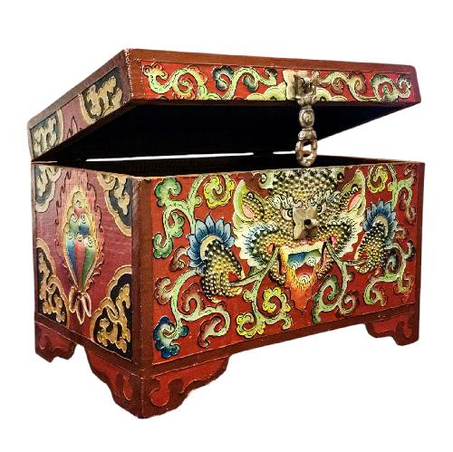 A Tibetan wooden box is a handcrafted storage container made from wood and often adorned with intricate Tibetan motifs and vibrant colors. These boxes are typically crafted by skilled artisans using traditional techniques passed down through generations. The decorations on the box usually include symbols of good fortune, such as lotus flowers, endless knots, dragons, or mythical creatures, and are painted in vivid hues like red, blue, green, and gold. These motifs not only add to the aesthetic appeal but also carry significant cultural and spiritual meanings in Tibetan Buddhism.