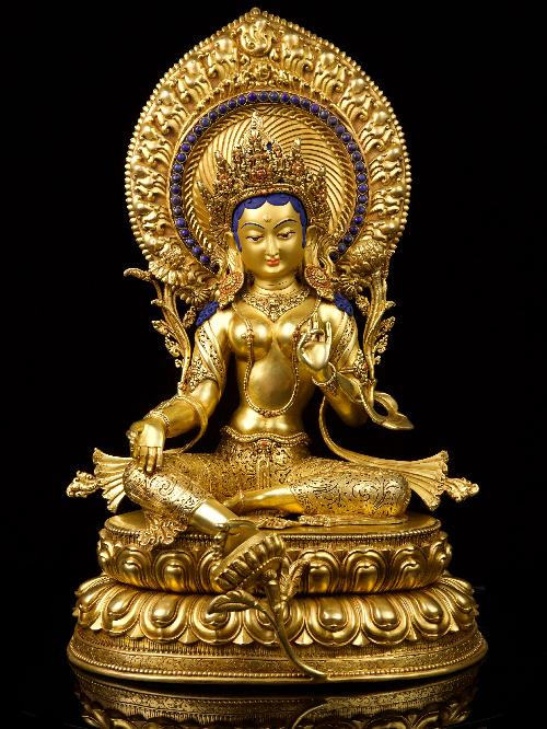 This Tara of Green Tara is made by the process of the Lost Wax system. This is a very complicated, time consuming and historic process of making metal sculptures.Which is why it is sometimes called Precision Casting as well. Hence the sculptures made by this process are comparatively expensive. There are many new, advanced and less time consuming methods of casting metal sculptures available as well. But due to the benefits provided by the traditional lost wax system in quality control and customization, we prefer the Loss wax system over Ceramic molding, or sand casting to make our Tara.