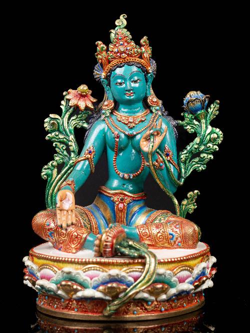 Beyond their decorative purpose, these semi-precious stones carry symbolic significance in various cultures and traditions. Turquoise is often associated with protection and healing, coral represents vitality and passion, while lapis lazuli symbolizes wisdom and truth. The inclusion of these stones not only adds to the aesthetic allure of the Green Tara but also imbues it with deeper meaning and cultural symbolism.