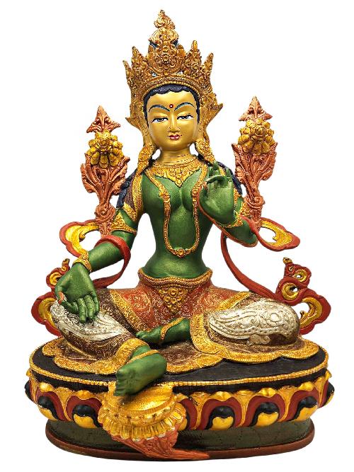Beyond their decorative purpose, these semi-precious stones carry symbolic significance in various cultures and traditions. Turquoise is often associated with protection and healing, coral represents vitality and passion, while lapis lazuli symbolizes wisdom and truth. The inclusion of these stones not only adds to the aesthetic allure of the Green Tara but also imbues it with deeper meaning and cultural symbolism.