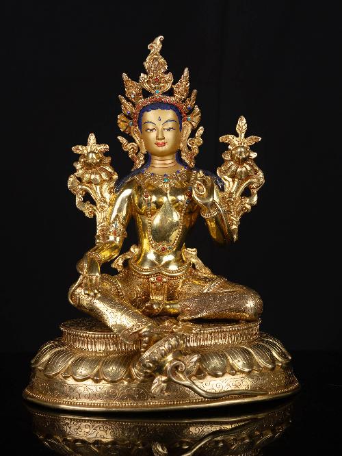 This Green Tara is finished with full gold plating. also known as mercury gold plating or fire gold plating. This traditional technique involves the application of a genuine layer of gold onto the Green Tara. Referred to as mercury gold plating, it is considered the correct and authentic form of gold plating in Nepal. Despite being more expensive than electroplating, this traditional mercury gold plating is gaining popularity again in Nepal. People are drawn to its authenticity, longevity, and the unmatched beauty it brings to the Green Tara. The resurgence of interest in this traditional form of gold plating reflects a growing appreciation for the craftsmanship and cultural heritage of Nepal