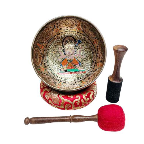 10cm Singing Bowl, Buddhist Hand Beaten, With Fine Etching Carving, Ganesh, Thangka Color Painted, Select Accessories