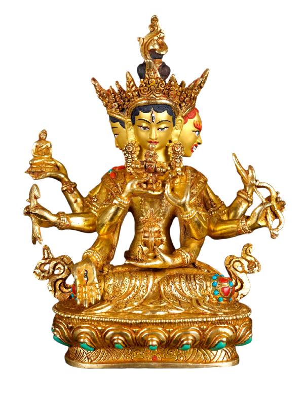 The face of Namgyalma is painted with gold to enhance its significant features, particularly the eyes, and lips. This detailed painting is essential as it brings forth the crucial attributes of the expression of eyes and lips that metal carving alone cannot capture.