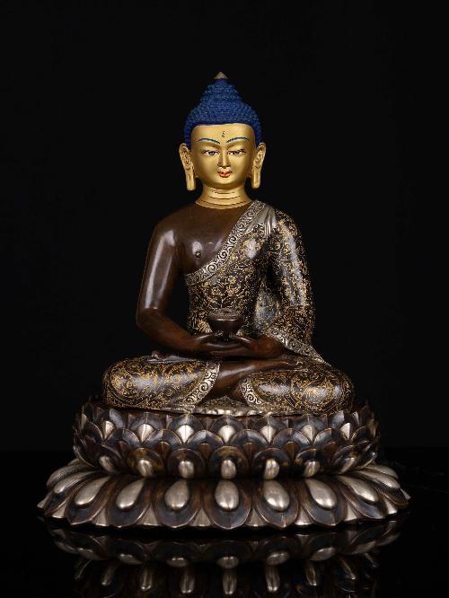 This Medicine Buddha has a Partly gold-plated finish. Partly fire gold gilding, a common practice in Nepali handicrafts. This technique is skillfully employed by artisans to create intricate designs on various metal objects, including statues, jewelry, and decorative items. Through a process, a mask or resist is applied to safeguard specific areas from the gold plating. The object is then subjected to high temperatures, allowing the gold to beautifully adhere to exposed surfaces using a combination of heat and pressure.