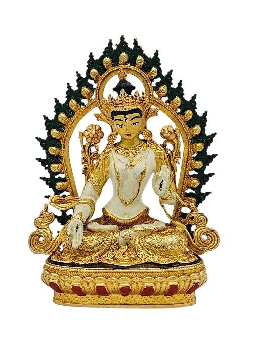 This Padmasambhava has finished in a full gold Plated antique patina. The Antique finishing imparts a sense of age and character to the Padmasambhava, enhancing its overall appeal. In the Antique finishing process, after the Gold plating is applied, a carefully applied layer of varnish is added. This varnish not only contributes to the antique look but also serves as a protective barrier, ensuring the longevity of the gold plating. It helps to safeguard the gold layer but also prevents tarnishing for an extended period. Read More . . .