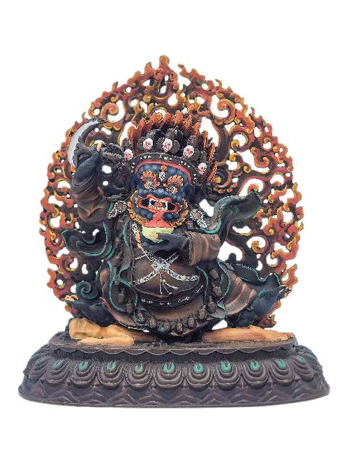 This 11cm tall Mahakala, Kajupa, Buddhist Miniature Statue, Chocolate Oxidized, Thangka Color Finishing (Product Code: HMS35758) weighs 0.41kg and is available at an offer price of US$60.