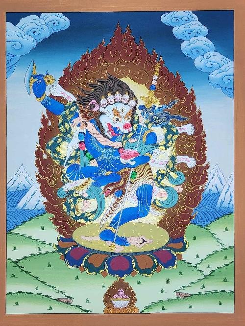 A thangka, also known as tangka, thanka, or tanka, is a vibrant and intricate Tibetan Buddhist painting that serves as a visual representation of spiritual teachings. Crafted with meticulous detail on cotton or silk appliqué, thangkas depict a wide range of subjects including Buddhist deities, sacred scenes, mandalas, and narrative stories. These sacred artworks are traditionally kept unframed and rolled up for storage, resembling ancient scrolls. To protect their delicate nature, thangkas are mounted on textile backings and often adorned with a silk cover on the front. Proper preservation in dry environments is crucial to maintain the integrity and longevity of the silk. Read More . . .