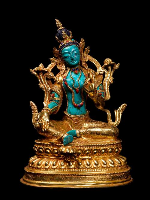 22cm Monastery Quality Statue Of Green Tara, Partly Gold Plated, Painted Face