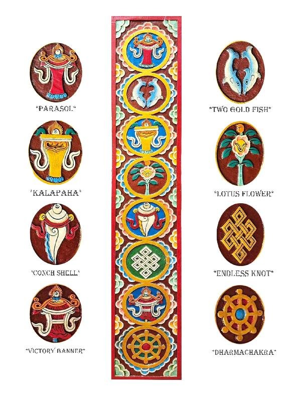 By employing this traditional coloring method, the Ashtamangala is not only aesthetically pleasing but also maintains its cultural authenticity, paying homage to the rich traditions and practices associated with Buddhist art.
